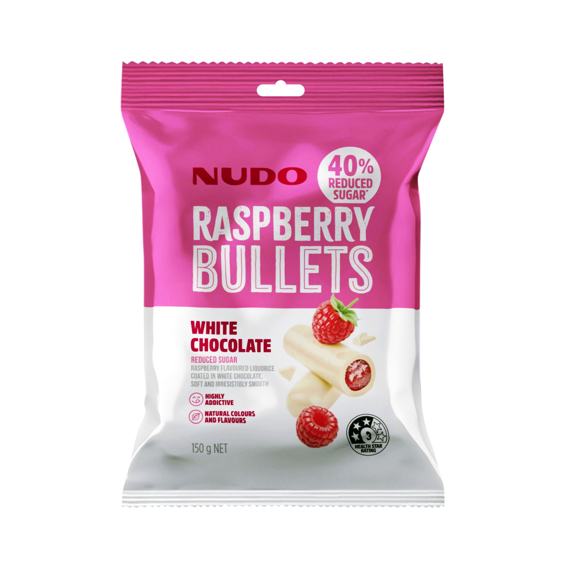 *Contains at least 40% less sugar than standard white chocolate raspberry flavoured bullets.